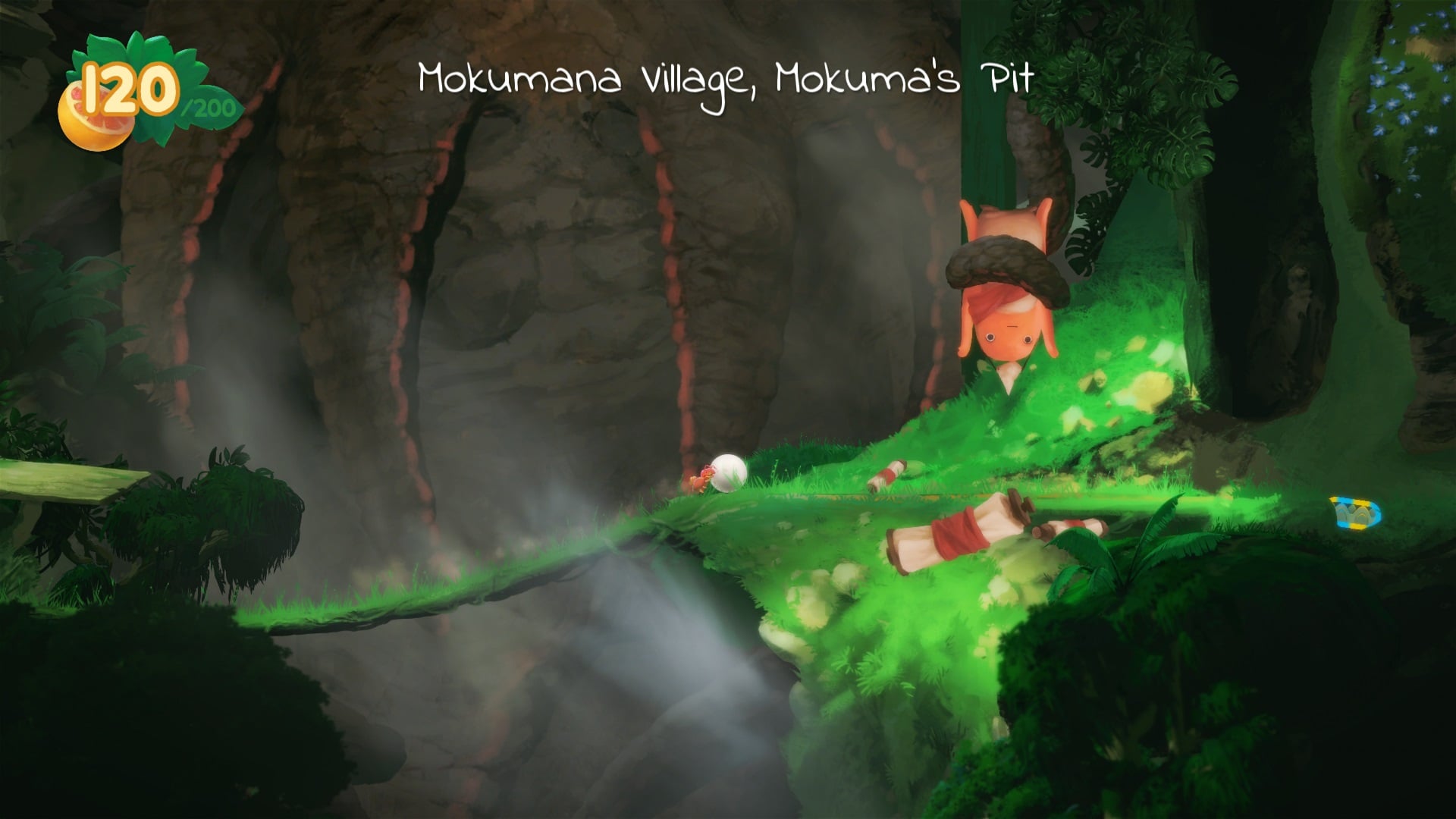 Speaking of fruit, these are the game’s currency. You will find fruit everywhere, in puzzles, under bushes, as you randomly bump into things, and in chests. I also noticed that I lost a few when I landed in the thorn pits during the pinball segments, although that didn’t happen every time. As well as fruit, you are also on the lookout for ‘Wickerlings’ – these are small Groot-like root-based beings who are found sticking out of the ground in various locations. Every time you possess ten of these, you can use them to activate strange statues. What for? I have no idea yet as I’ve not collected them all.