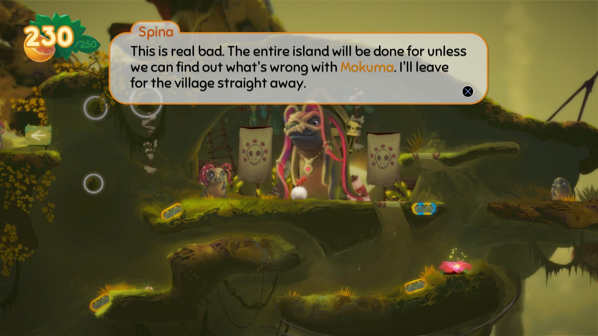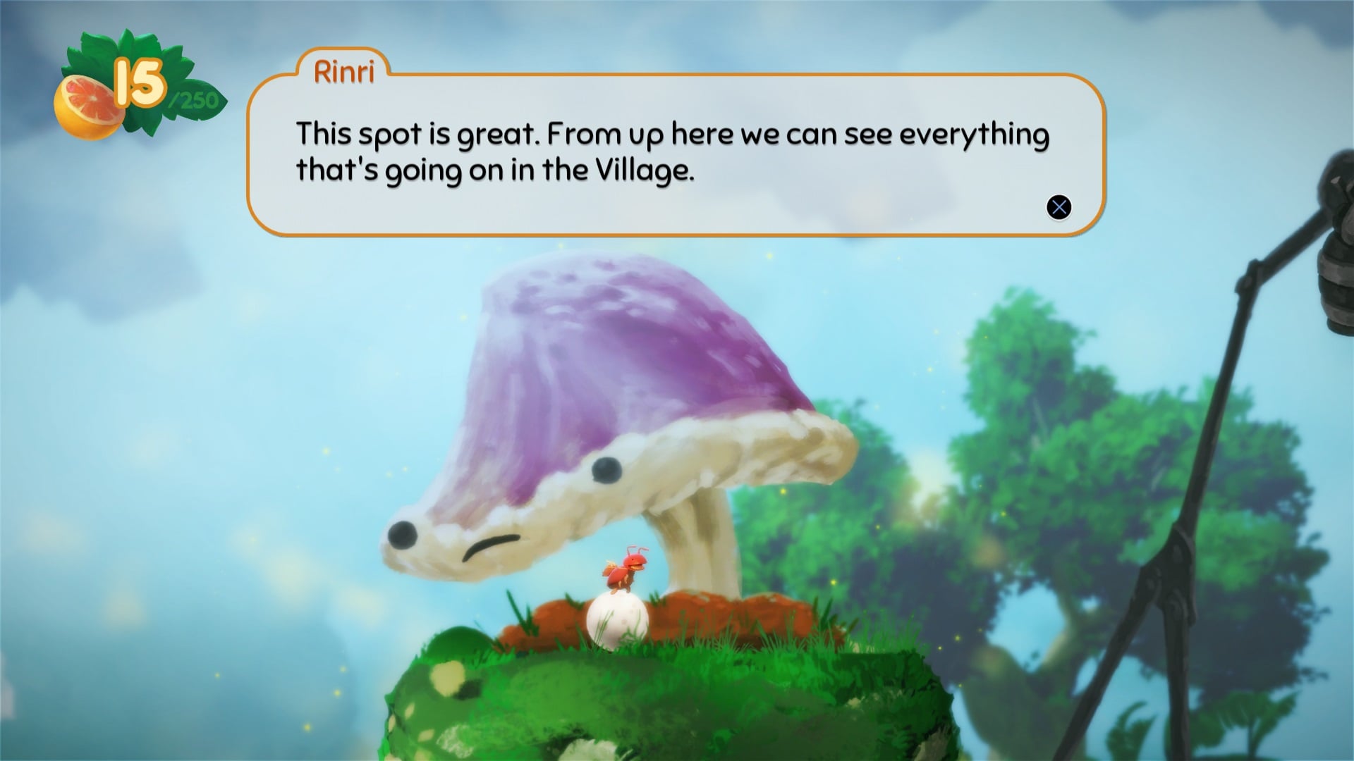 This is a frustrating yet also relaxing game. You aren’t going around jumping on enemies and killing them, you are trying to traverse across the vast island and work out how to get to each of the new areas whilst helping people out and delivering your mail. Once you have saved the first ‘boss’ and delivered a special letter to him, you will also gain access to the skyline. This is basically the game’s version of quick travel. You pay 100 fruit to unlock it and then you can shoot yourself to any point along that particular path and drop down wherever you wish. There are three of these in total, from what I can see.